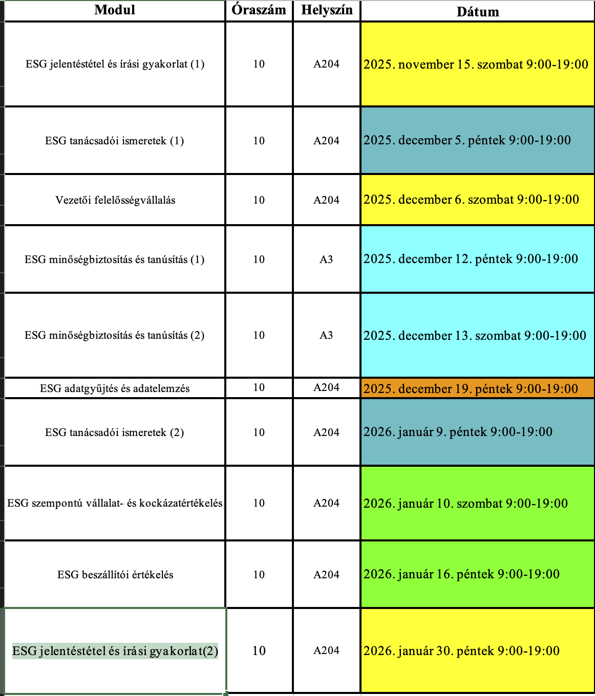 | Fenntarthatósági és ESG keretrendszer (2) | online | 10 |